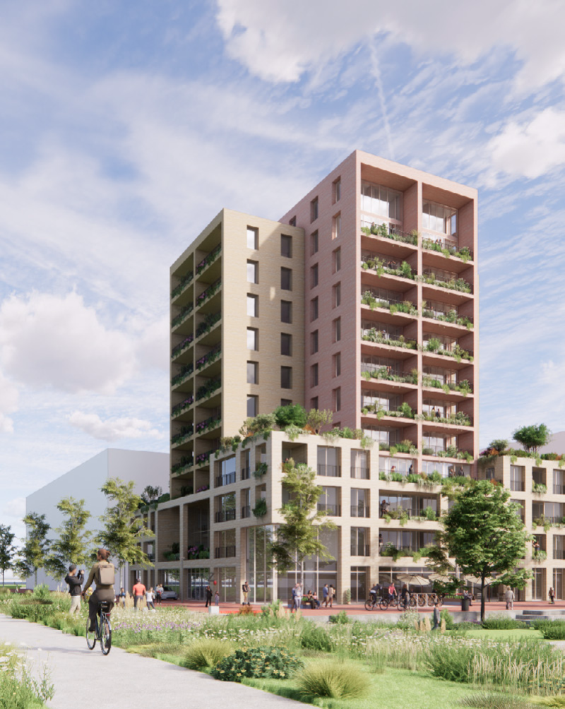 De ligging achter de Zuider Ijdijk, bij de uitmonding van het Amsterdam Rijnkanaal en aan het Waterplein is bepalend geweest voor het ontwerp. Een binnenstraat die van de groene IJdijk naar de binnentuin loopt vormt de ruggengraat van het plan. Hier bevinden zich de ontsluitingen van de woningen en wordt het informele ontmoeten van de bewoners gefaciliteerd. Aan het Waterplein is de gevel open van karakter en vormt een overgang tussen het gebouw en de watersportactiviteiten buiten. Boven de vierlaagse plint is een kruisvormige toren gepland. Samen vormen ze een herkenbaar en uitnodigend gebouw dat architectuur verbindt met duurzaamheid.